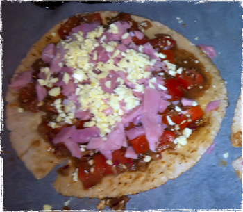 Pre-heat oven to 200d Celcius, spread tomato mixture evenly on pita bread on lined baking tray. Sprinkle with ham and remaining cheese.